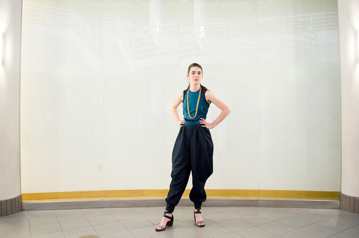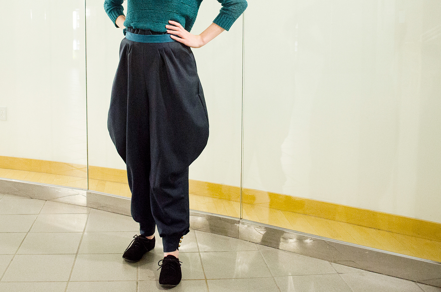 Custom pants that were designed, patterned, sewn, and fit by me. The pants were meant to be fun and dramatically draped so they could be worn in a formal setting or in casual wear.